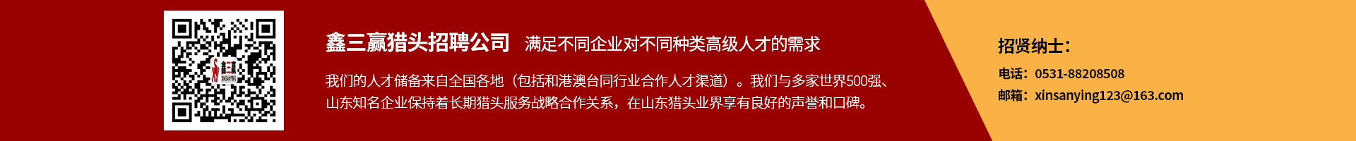 鑫三贏獵頭招聘公司(0531-88208508)是山東本土的知名專業(yè)獵頭招聘公司,幫助企業(yè)解決中高端招聘難題 ,免費幫助人才推薦更好的工作機(jī)會。公司總部位于山東省省會濟(jì)南市。我們致力服務(wù)于山東省內(nèi)大中型內(nèi)外資企業(yè),我們通過對客戶企業(yè)的組織結(jié)構(gòu)、相關(guān)業(yè)務(wù)和具體職位的研究、分析,能夠很好的與企業(yè)及候選人進(jìn)行溝通,滿足不同企業(yè)對不同種類高級人才的需求,我們的人才儲備來自全國各地(包括和港澳臺同行業(yè)合作人才渠道)。我們與多家世界500強(qiáng)、山東知名企業(yè)保持著長期獵頭服務(wù)戰(zhàn)略合作關(guān)系,在山東獵頭業(yè)界享有良好的聲譽和口碑。
